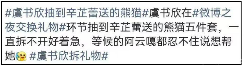 据悉,在今年的某场盛典活动现场,虞书欣在明星交换礼物环节,抽到了辛芷蕾准备的礼物,并得到提示,里面是熊猫五件套。
